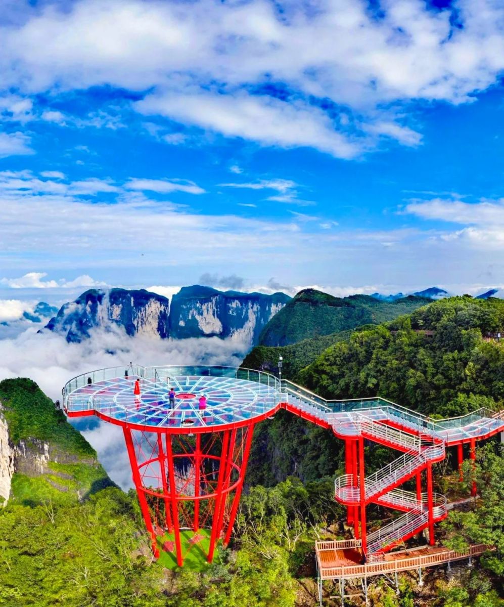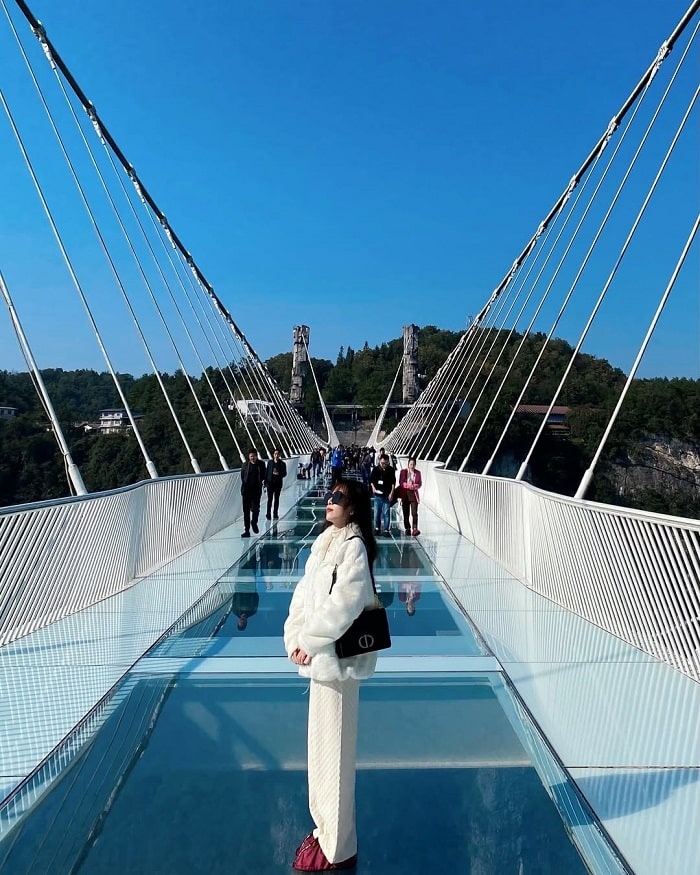 Trải nghiệm Sạn Đạo Kính (Cầu kính - con đường gác kính trên vách đá), con đường làm từ những tấm kính cường lực trong suốt, dày hơn 6cm. Con đường men theo vách núi dựng đứng, Skywalk đã trở thành một trong những điểm thu hút khách du lịch hấp dẫn nhất tại Trương Gia Giới.
