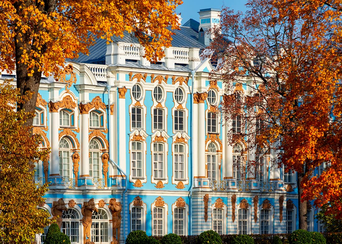 Cung điện Mùa Thu Ekaterina (Catherine Palace): Biểu tượng xa hoa của triều đại Romanov và là kiệt tác tuyệt đỉnh của nghệ thuật Baroque Nga. Mặt tiền dài gần 300 mét sơn xanh – trắng – vàng nổi bật giữa khu rừng Tsarskoye Selo tạo nên vẻ đẹp tráng lệ khó sánh. Bên trong, những phòng đại lễ dát vàng lấp lánh, tường gương phản chiếu ánh sáng và đặc biệt là Phòng Hổ Phách nổi tiếng thế giới – “Báu vật của nước Nga” được phục dựng công phu từ hàng tấn hổ phách Baltic. Toàn bộ cung điện mang vẻ sang trọng, tinh xảo, cho du khách cảm giác như đang bước vào thời kỳ hoàng kim của giới quý tộc Nga.