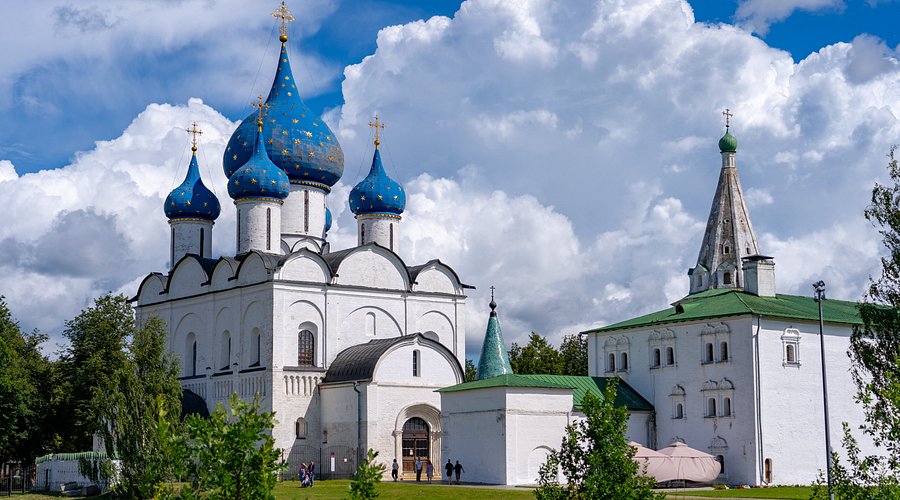 Kremlin Suzdal: Là trung tâm lịch sử lâu đời nhất của Suzdal, hình thành từ thế kỷ X–XI. Khu kremlin nằm trên một gò đất cao, được bao quanh bởi tường đất và hào nước tự nhiên, tạo nên cấu trúc phòng thủ đặc trưng thời Rus cổ. Bên trong có Nhà thờ Đức Mẹ Giáng Sinh (Nativity Cathedral) với mái vòm xanh gắn sao vàng – Biểu tượng của Suzdal. Đây là một phần quan trọng trong di sản kiến trúc đá trắng vùng Vladimir–Suzdal đã được UNESCO