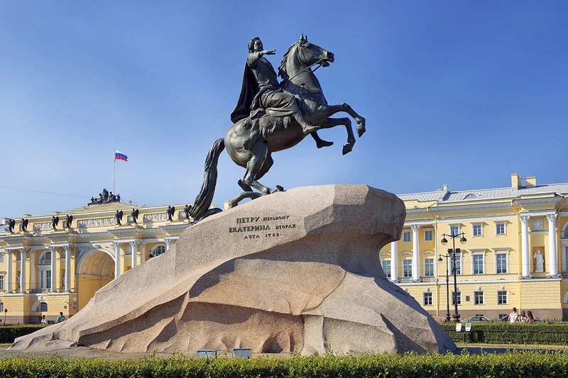 Tượng đài Pie Đại Đế: Đoàn tiếp tục đến Tượng đài Pie Đại Đế – Biểu tượng nổi tiếng của Saint Petersburg, ghi dấu hình ảnh vị Sa hoàng sáng lập thành phố. Bức tượng đồng cưỡi ngựa vươn mình mạnh mẽ trên khối đá granite khổng lồ thể hiện tinh thần cải cách táo bạo và khát vọng đưa nước Nga trở nên hùng cường.