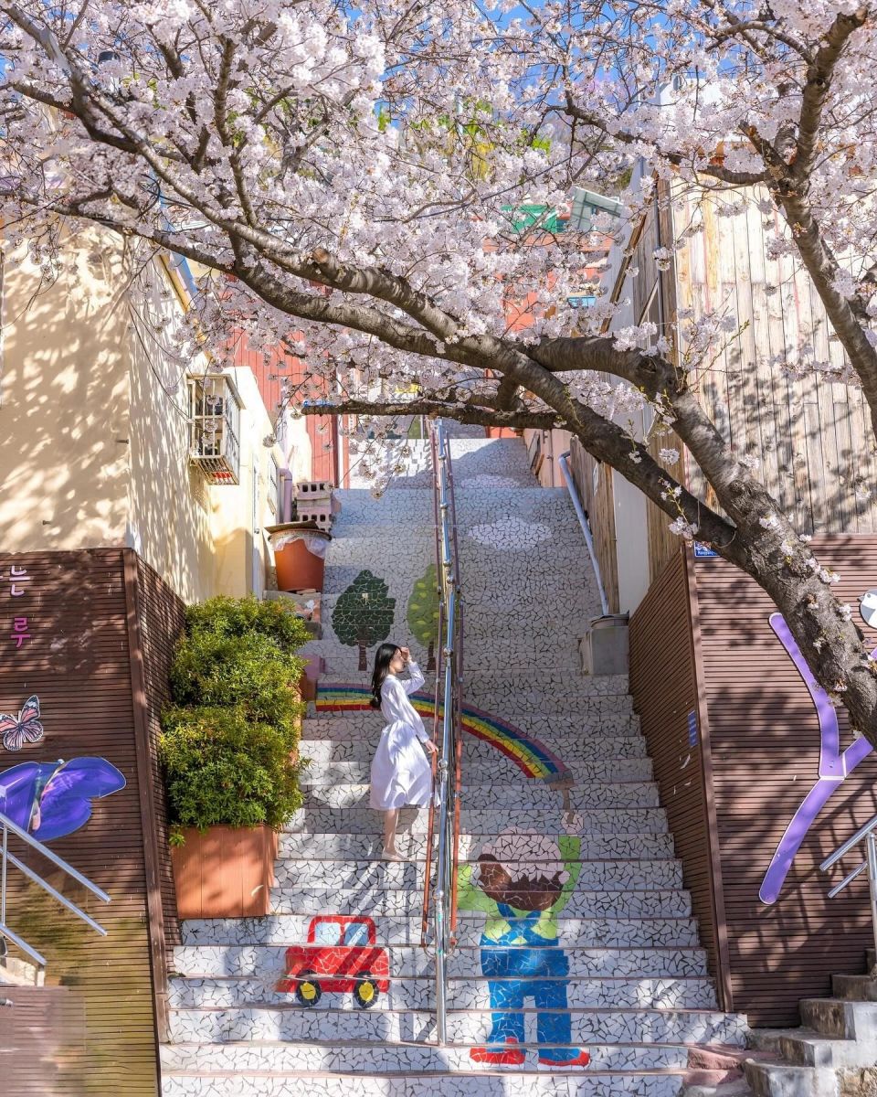 Đây là địa điểm check in nổi tiếng ở Busan với những bậc cầu thang lát gạch tạo thành những bức bích họa 3D độc đáo. Vào mùa xuân, những tán anh đào màu hồng phấn dưới nắng như tô điểm thêm sắc hoa. Ngôi làng luôn nhộn nhịp, đông đúc khách qua lại.
