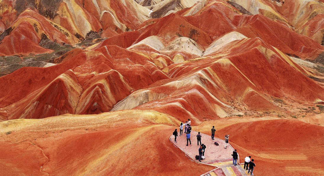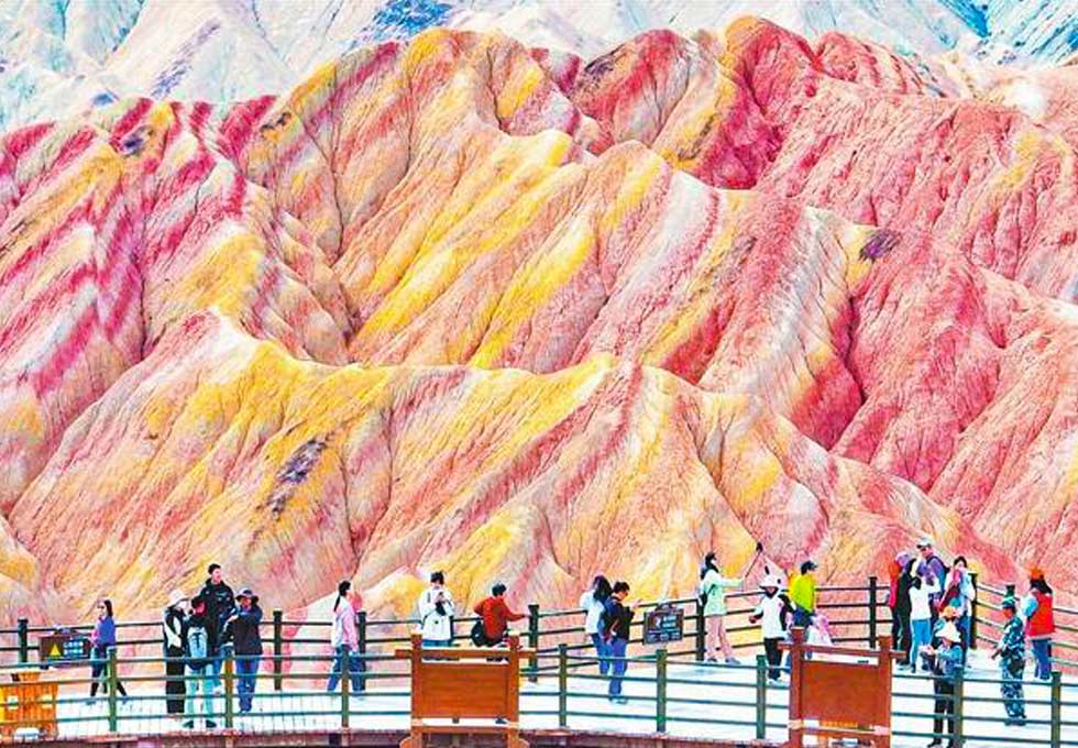 Ngoài Đôn Hoàng, Trương Dịch cũng là điểm đến rất nổi tiếng với Công viên địa chất Đan Hà Trương Dịch. Khu vực này được biết đến với những dãy núi đá nhiều màu sắc tạo thành khung cảnh tự nhiên vô cùng độc đáo. Khi ánh nắng chiếu xuống, các lớp đá đỏ, vàng, cam và xanh hiện lên rõ nét, khiến nơi đây được ví như “cầu vồng trên mặt đất”.