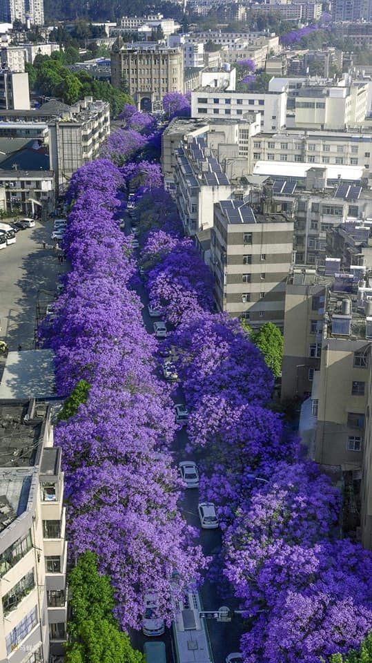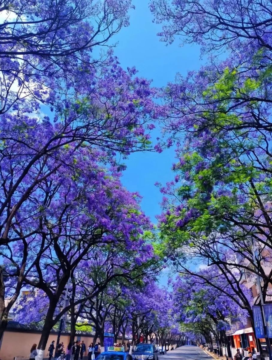Nằm ở trung tâm Côn Minh, Đường Giáo Trường nổi tiếng là con đường đẹp như tranh vẽ mỗi khi hoa phượng tím vào mùa. Những tán cây phượng vươn cao phủ kín lối đi, tạo thành mái vòm mộng mơ sắc tím. Dưới ánh nắng dịu nhẹ của tháng 5, từng chùm hoa rung rinh theo gió, thả nhẹ cánh mỏng manh như khẽ gọi mời một cuộc hẹn thanh xuân.