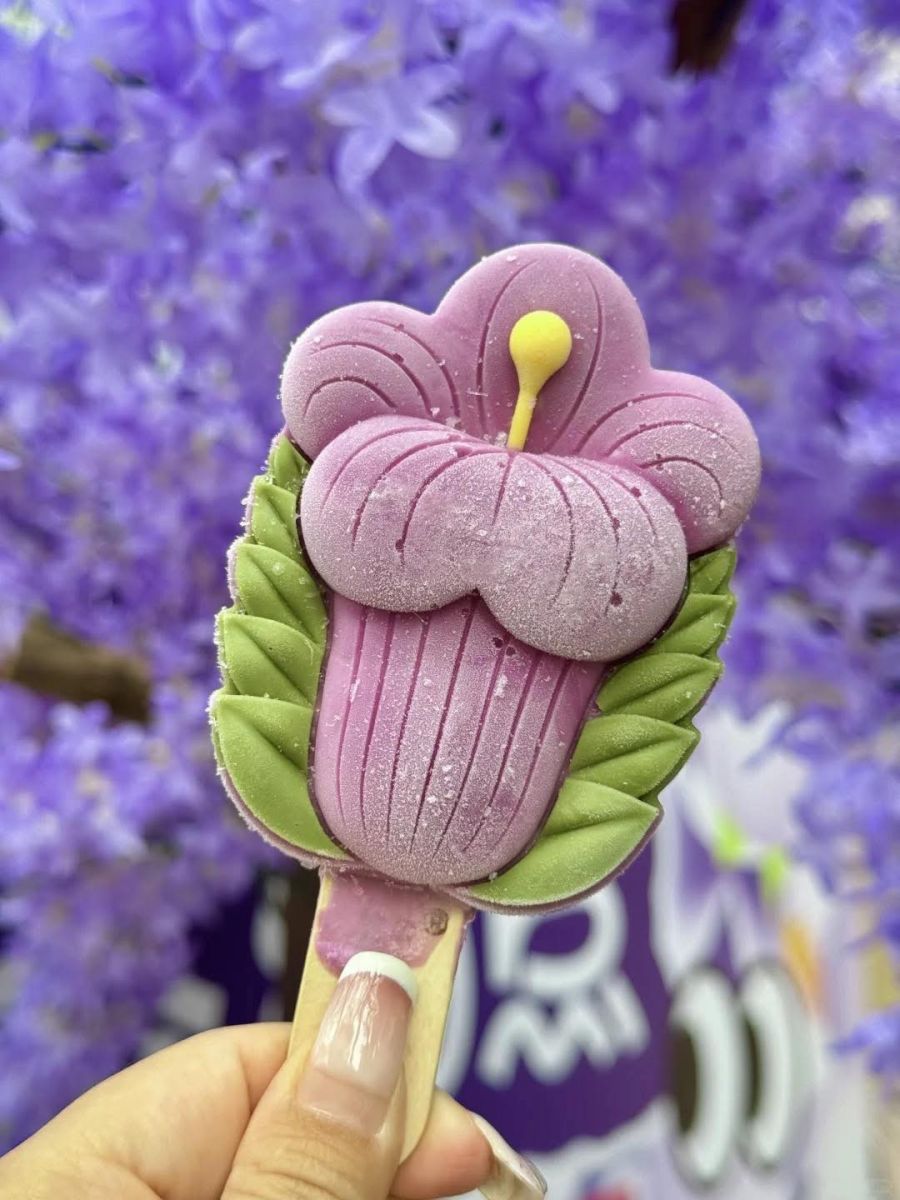 Một trong những điểm độc đáo khiến tour xe buýt ngắm phượng tím trở nên đáng nhớ chính là “kem văn hóa” – món quà tặng kèm trong giá vé. Không chỉ đơn thuần là món tráng miệng giải nhiệt, cây kem này được tạo hình đặc biệt: