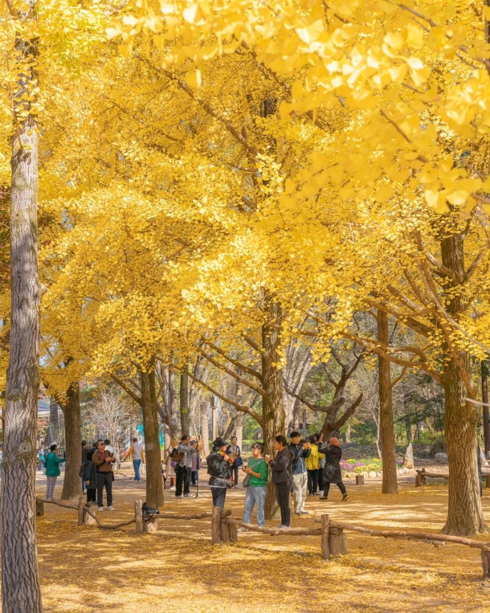 Nếu chỉ được chọn một nơi để dừng chân, thì chắc chắn đó là con đường ngân hạnh – biểu tượng mùa thu của Nami. Hàng cây vươn cao, tán lá rợp vàng như ánh nắng rơi xuống từ bầu trời. Khi gió thổi, từng chiếc lá vàng khẽ rụng, rắc xuống vai áo người đi như những hạt mưa mùa thu.