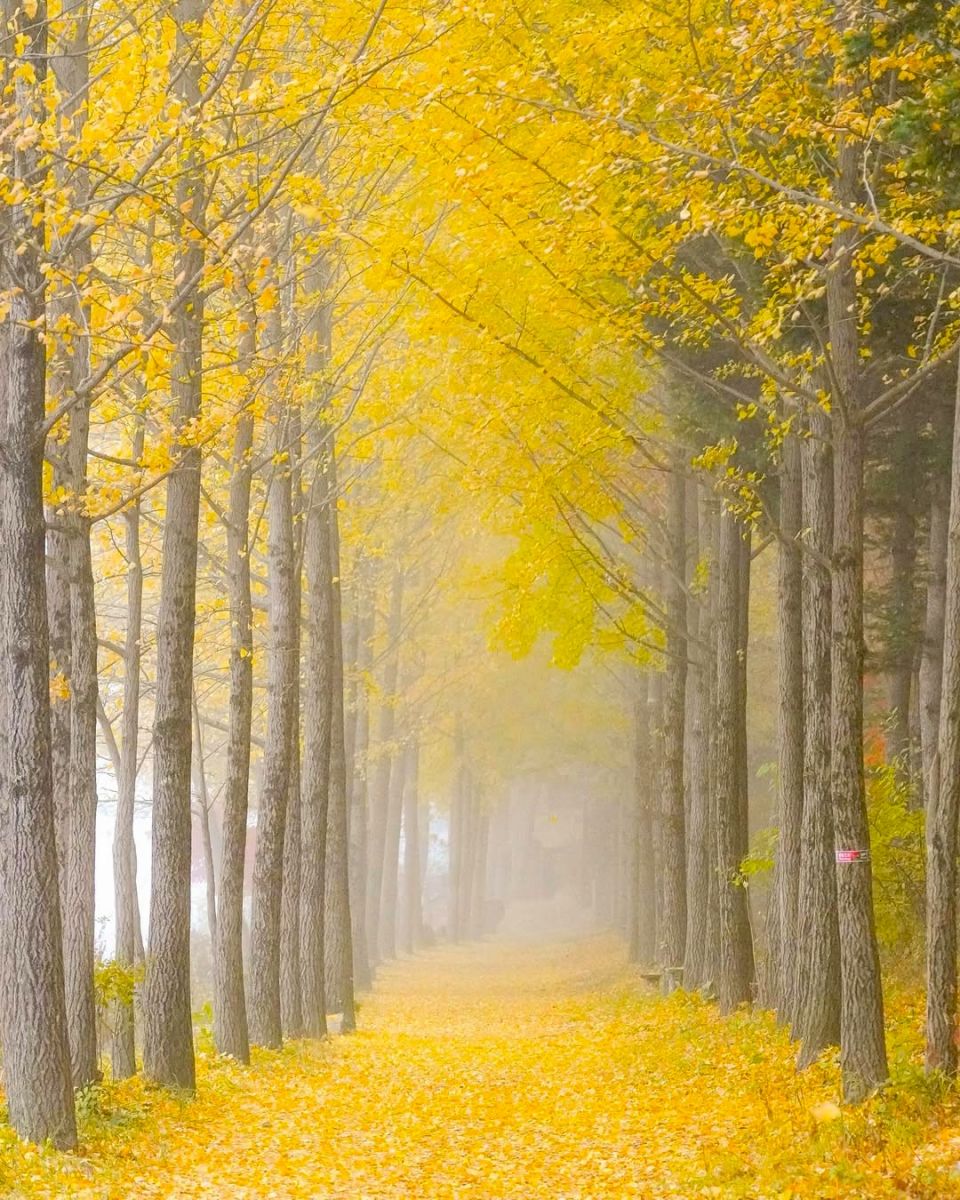 Mùa thu trên đảo Nami là thời khắc thiên nhiên ngân lên bản nhạc rực rỡ nhất trong năm. Ánh nắng như sợi chỉ vàng, rải đều trên những hàng cây thẳng tắp. Lá phong đỏ rực như ngọn lửa, lá ngân hạnh vàng óng như tấm lụa trải dài, tất cả hòa quyện thành một khúc giao hưởng lộng lẫy.