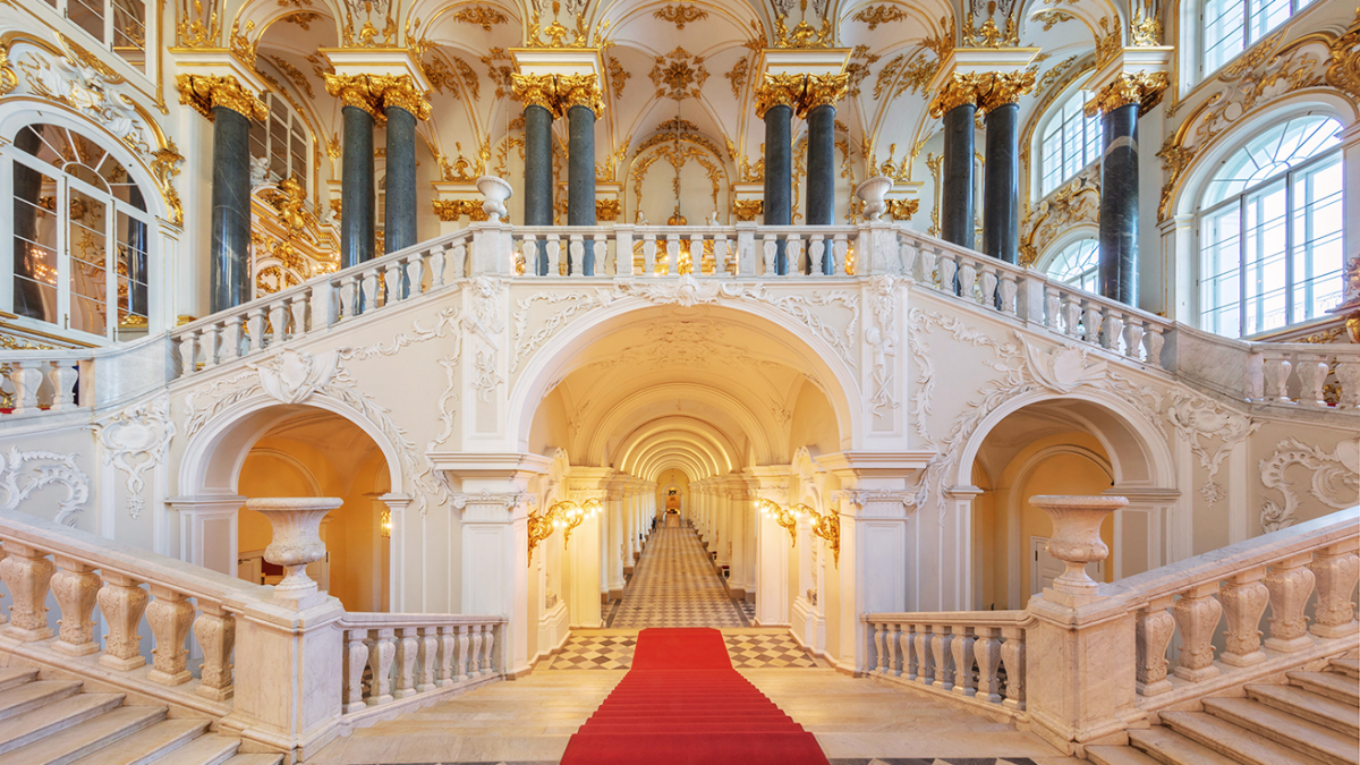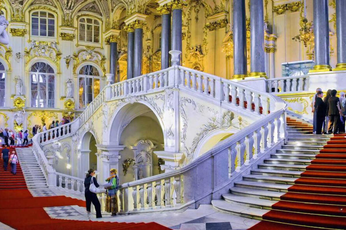 Bước vào bên trong Hermitage, du khách dễ dàng bị choáng ngợp bởi quy mô và sự tinh xảo của kiến trúc cung điện. Các đại sảnh rộng lớn, trần cao, cầu thang hoành tráng và những chi tiết trang trí mạ vàng phản ánh rõ sự xa hoa của triều đại Nga hoàng. Không gian nội thất không chỉ đóng vai trò nền cho các tác phẩm nghệ thuật mà bản thân nó đã là một kiệt tác. Mỗi căn phòng mang phong cách thiết kế khác nhau, từ cổ điển châu Âu đến những ảnh hưởng phương Đông. Việc di chuyển qua các sảnh liên tiếp tạo cảm giác như đang tham quan nhiều cung điện trong cùng một quần thể. Trải nghiệm kiến trúc này khiến chuyến tham quan Hermitage trở nên trọn vẹn ngay cả với những du khách không chuyên về mỹ thuật.